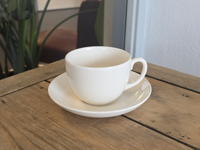 in mooie staat, doorsnede kopje 9 cm, hoogte 6,5 cm, doorsnede schotel 14,5 cm