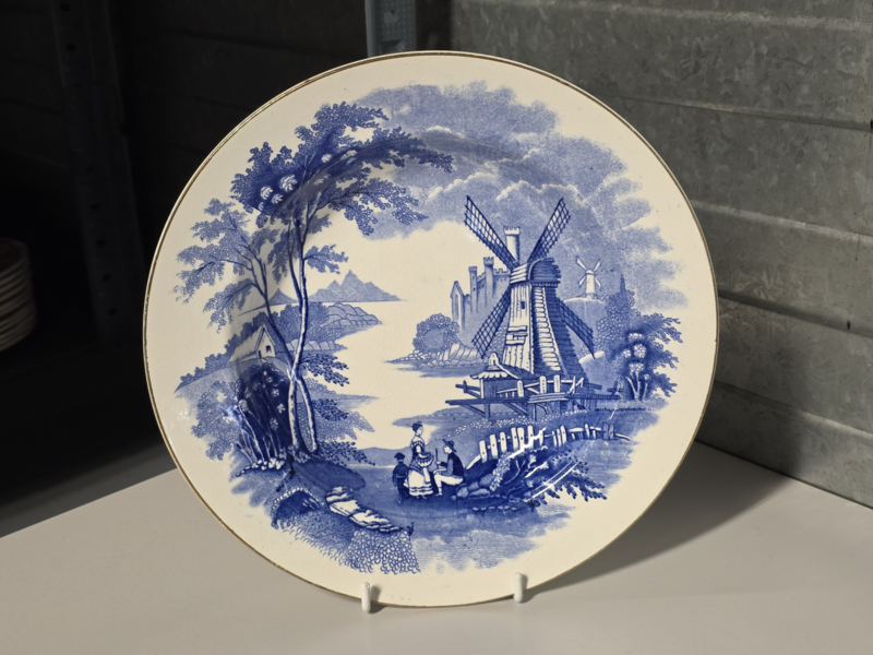 Engels blauw Palissy Ware Windmill diep bord 24,5 cm