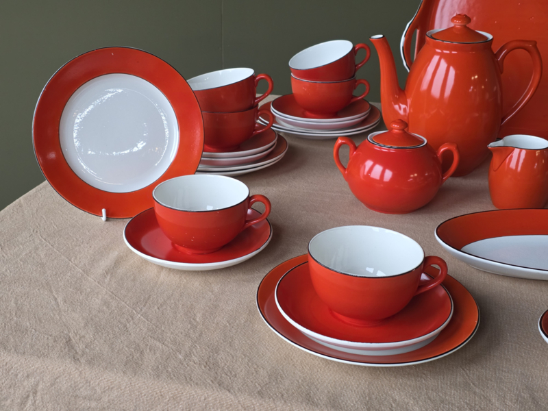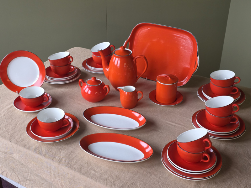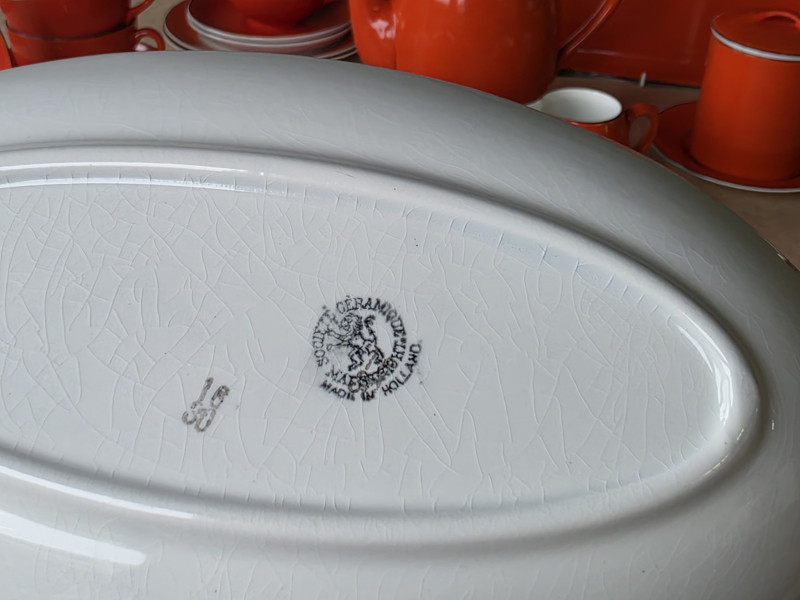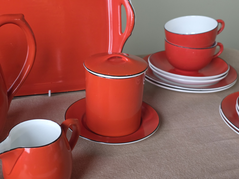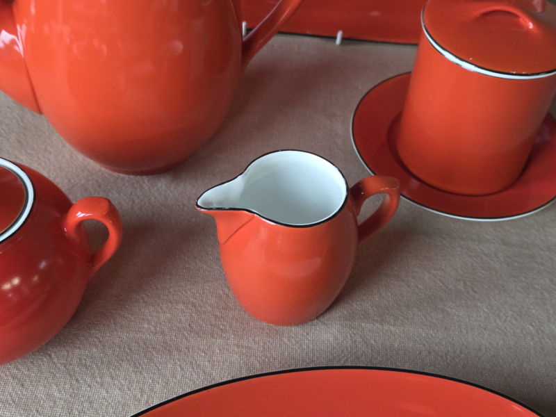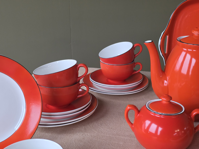 Het servies is mooie staat, er kan craquelee aanwezig zijn. Het roomkannetje heeft een chipje aan de tuit. De kleur is een prachtige oranje-rood tint.