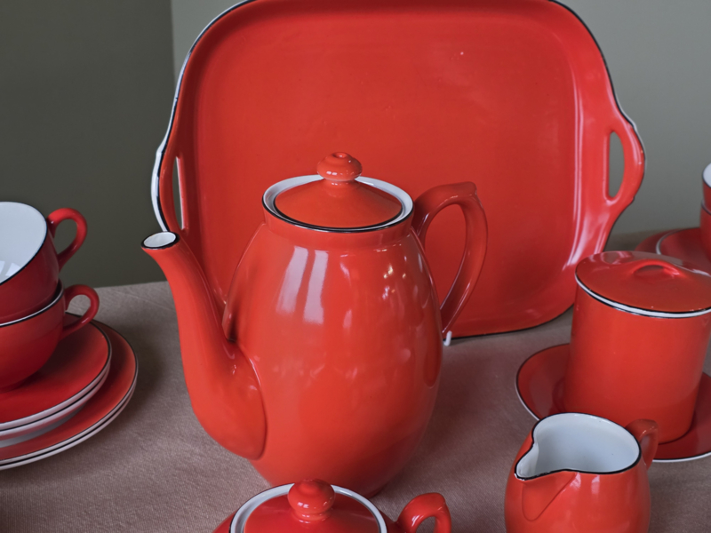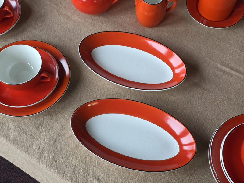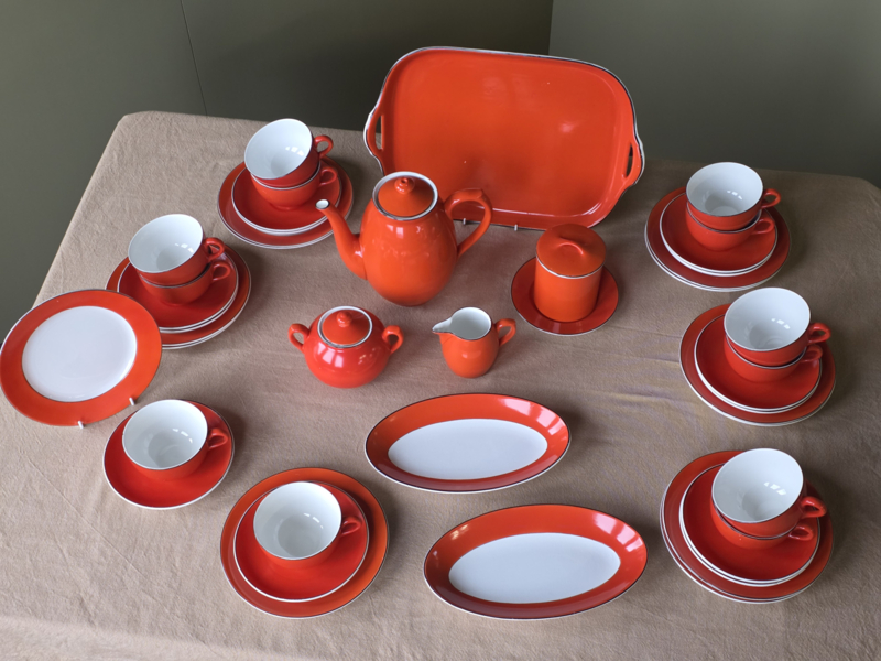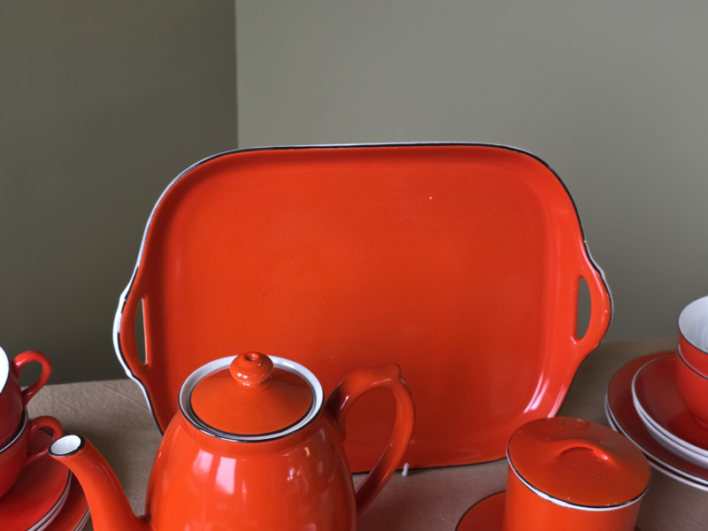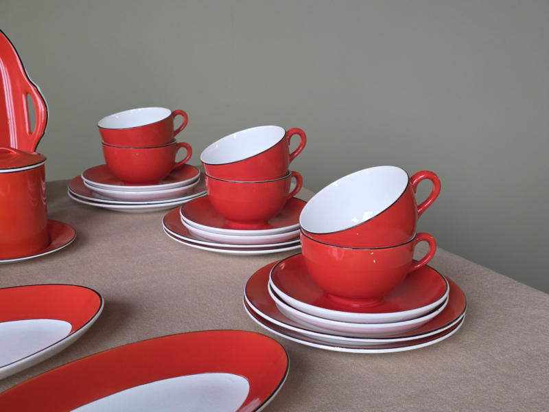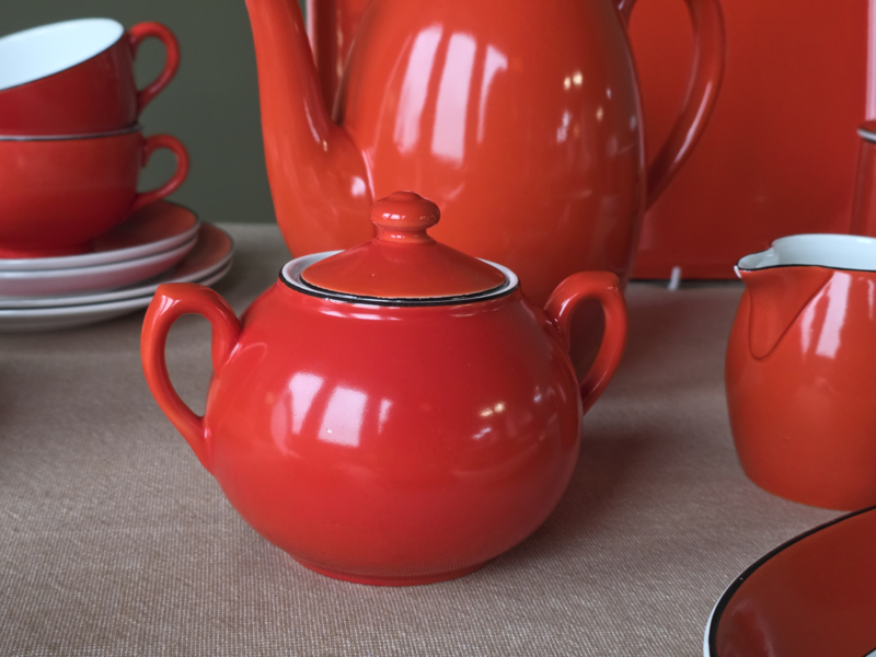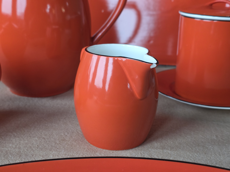 Het servies is mooie staat, er kan craquelee aanwezig zijn. Het roomkannetje heeft een chipje aan de tuit. De kleur is een prachtige oranje-rood tint.