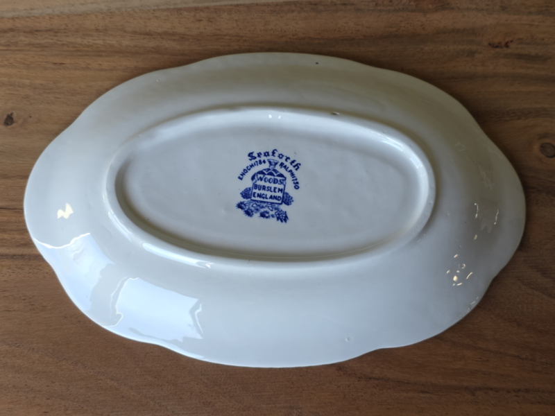 Engels blauw Woods Burslem England Seaforth ovale schaal 22 cm