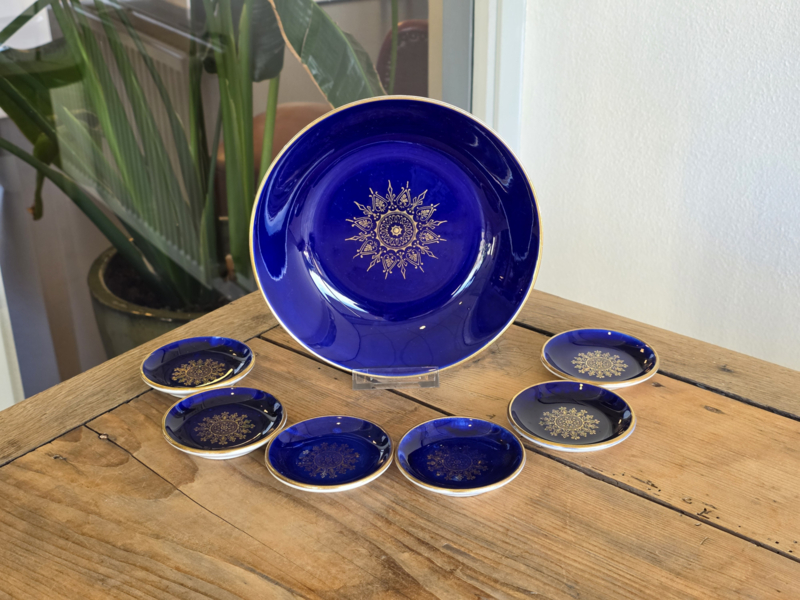 in mooie staat, 1x schaal Ø 19 cm, 6x kleine Ø 7 cm in voorraad: 1x deze set (heel zeldzaam) Societe Ceramique Bohemian